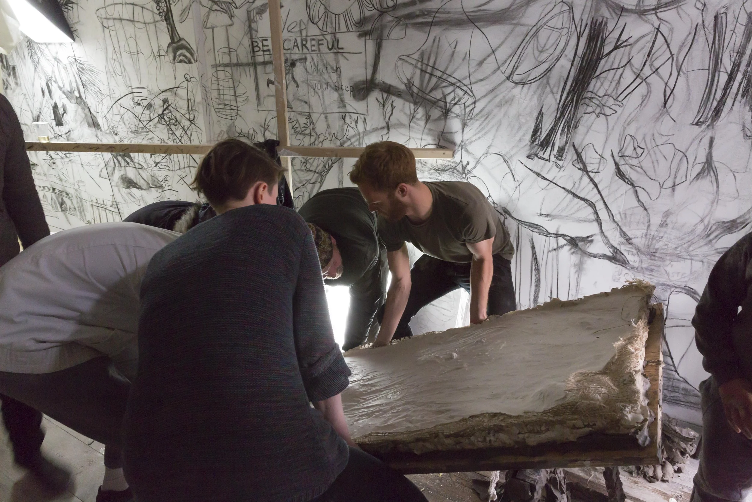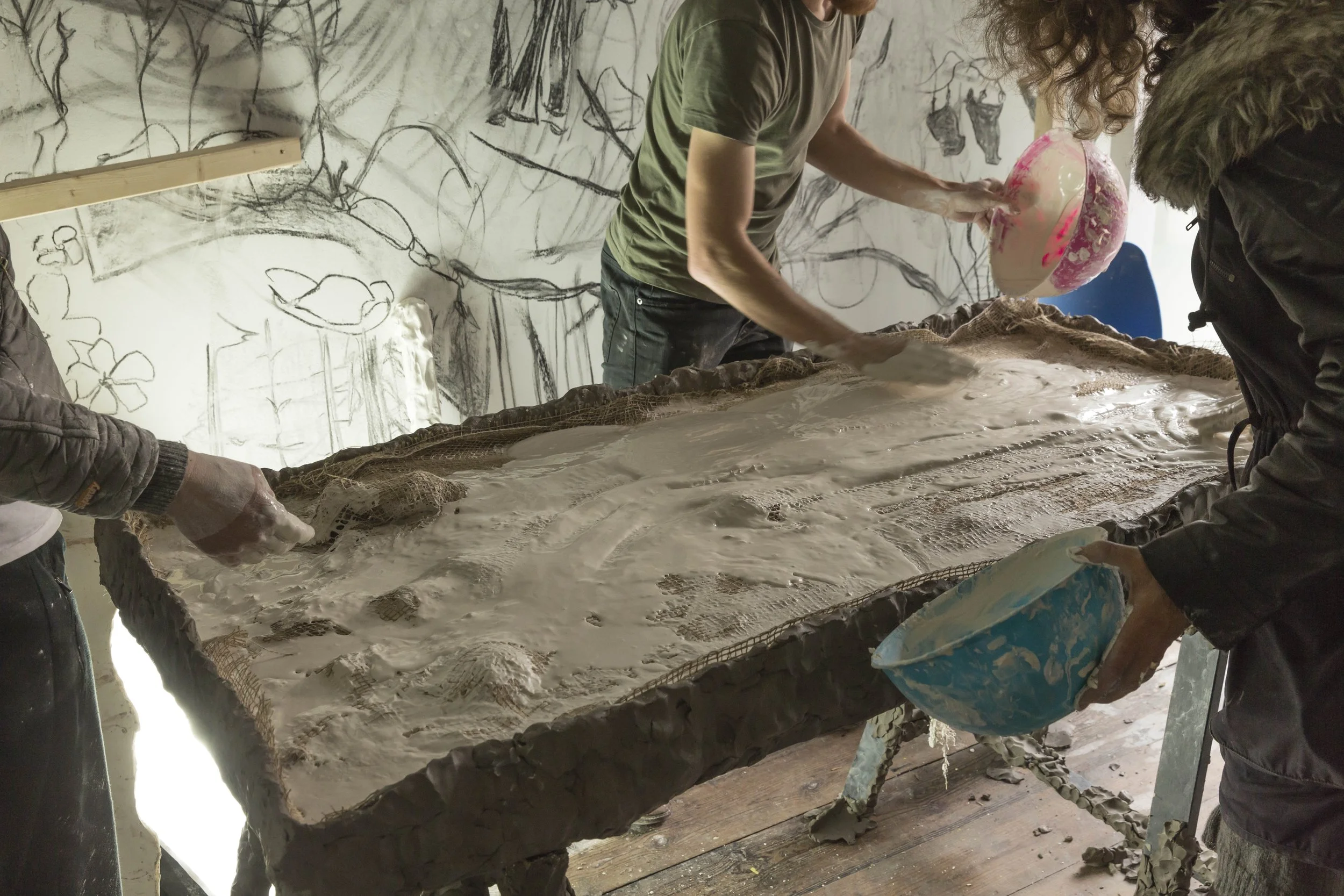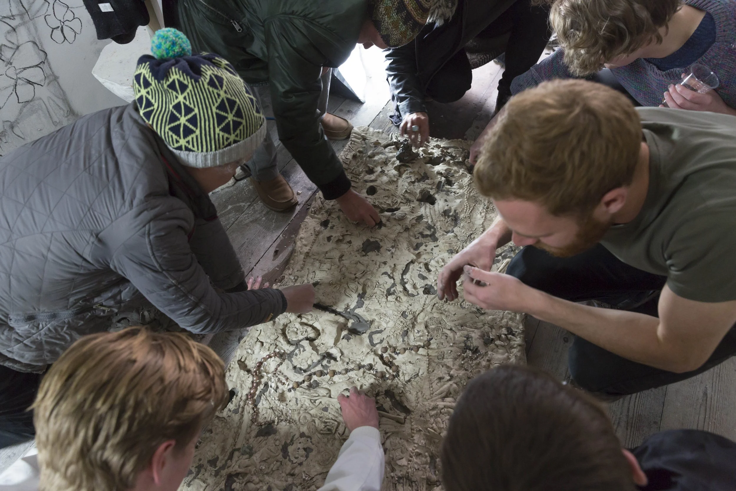 The Excavation Table, a table covered with clay and forming part of the Total Artwork installation for "The Nightingale" at Open School East, led by Matthew Darbyshire, May 2017. Visitors were invited to carve/press/mould and excavate clay on the top of the table which was then cast into plaster, with residual clay further excavated from the set plaster. Collaboration with Chloe Ashley, Kris Lock, Jo Murray, and Jacob P Woods. The piece was recreated for a residency at Guest Projects, London, May 2017.